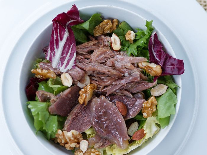 Pour la petite histoire, cette recette a vu le jour grâce aux remarques de nos fidèles clients en quête de nouveautés. Nous avons pour répondre à leurs attentes, rassemblé dans une seule et unique conserve : le canard et l'oie pour apporter des saveurs différentes et un jeu de textures grâce aux gésiers, aiguillettes et coeurs confits. Le résultat : une belle alchimie qui permet de réaliser de délicieuses salades composées. Pour réaliser une entrée périgourdine : faire tiédir doucement l'assortiment de salade au bain marie ou dans une poêle.Egoutter, et couper en lamelles que vous incorporez à une salade croquante. Ajouter quelques croûtons que vous aurez fait revenir dans la graisse de canard et quelques pignons de pin pour le "croquant". Disposer quelques tranches de magrets fumés. Assaisonner le tout avec une sauce moutarde, une goutte d'huile de noix Pour ajouter une touche originale à votre salade du Sud-Ouest, disposez une moitié de figue farcie au foie gras. Effet garanti.