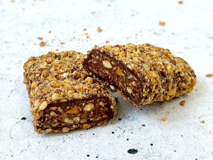 Un intérieur souple de morceaux de noix grillées, mélangés à du caramel, enrobé de chocolat noir puis roulé dans les morceaux de noix.