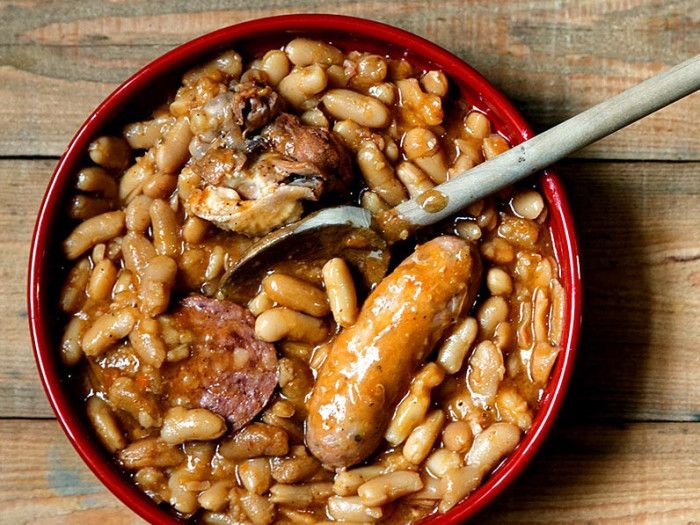 Haricots lingots de Vendée, saucisses de Toulouse (viandes de porc 90%,sel, sirop de glucose, correcteur d'acidité :E263, sucres, épices, antioxydants:E301,E3015,plantes aromatiques,arômes naturels,boyaux naturels), manchons de canard 15%, saucisson à l'ail (viandes porc 79.4%,gras de porc, blanc d'oeufs, sels, stabilisants, ail, épices, arômes,antioxydant,conservateur diphosphates,plyphosphates,triphosphates,dextrose,ail 0.2%,épices,arômes,antioxydant:erythorbate de sodium,conservateur:nitrite de sodium,colorant:cochenille), tomates, concentré de tomates: (tomates, sel), vin blanc, graisse de canard, carottes, oignons, amidon modifié de maïs, sel, épices Peut contenir des traces de gluten, lait, céleri, moutarde et fruits à coque.