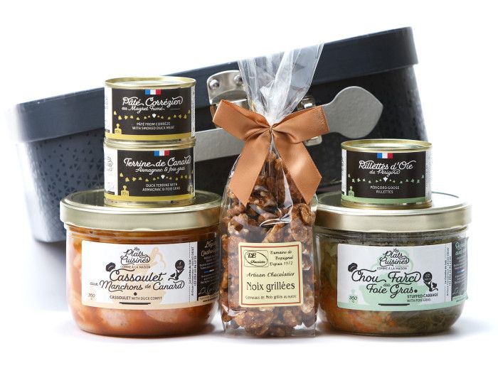 Cadeau gourmand dédié à une personne seule 3 pâtés, 2 plats cuisinés fabriqués dans notre conserverie en Corrèze Noix sucrées de Dordogne pour accompagner le café