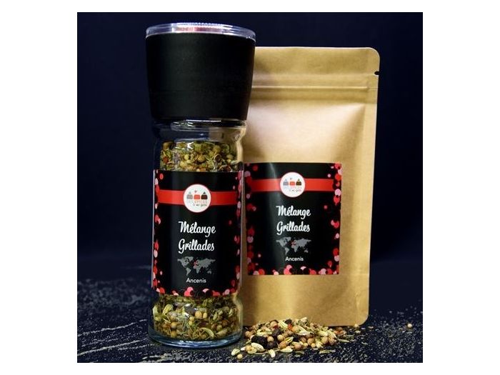 Spécialement conçu pour vos grillades, le mélange grillades sera votre ami tout l'été : c'est un mélange équilibré d'épices et d'herbes à moudre directement sur les viandes blanches ou poissons grillés. Vous pouvez ouvrir le moulin pour en mettre directement dans vos marinades pour les parfumer.