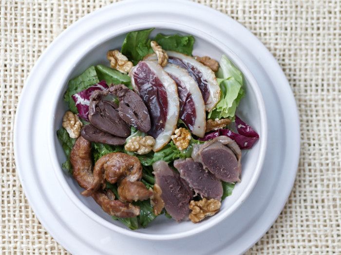 Les gésiers d'oies sont confits à feu doux dans la graisse d'oie. Ils sont tendres et fondants. Faire tiédir légèrement vos gésiers dans une poêle afin de parfaitement les dégraisser, égouttez, et coupez en lamelles que vous incorporez à une salade verte. Ajoutez quelques lamelles de magrets de canard fumé tranchés et des cerneaux de noix. Assaisonnez le tout avec une sauce à base de moutarde aux noix. L'astuce de La Combe de Job, faites revenir quelques pignons de pin pour apporter la touche croquante à votre salade Conservez le surplus de graisse dans un bocal au réfrigérateur pour réaliser des pommes de terre sarladaises.