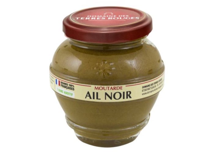 Le Domaine des Terres Rouges utilisent un ail noir transformé à partir d'ail frais origine France. L'étuvage consiste à placer les gousses d'ail à 80°C et 90% d'humidité pendant une durée de 3 semaines jusqu'à ce quelles deviennent tendres et moelleuses et soient de couleur noir ébène. Après séchage, l'ail développe des notes caramélisées et sucrées comme le vinaigre balsamique. La moutarde à l'ail noir est une moutarde d'exception au goût audacieux plutôt doux.