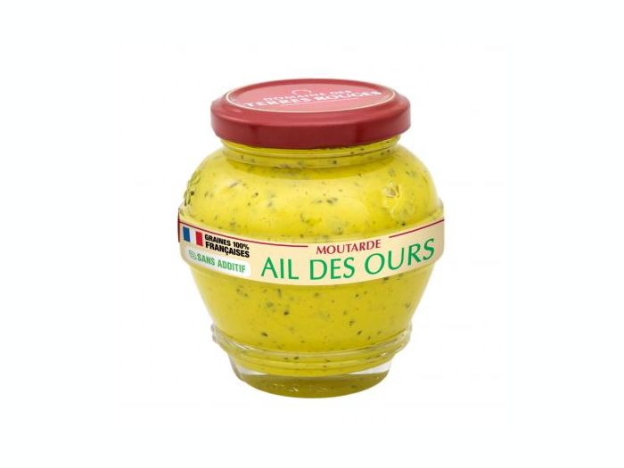 La moutarde à l'ail des ours est fabriquée par le Domaine des Terres Rouges avec des graines de moutarde 100% françaises, sans additif. Elle est très douce et aromatique. Elle est parfaite pour réaliser une vinaigrette de salade de pommes de terre et elle est agréable pour accompagner un poisson ou pour garnir une tarte salée. Idée recette :Rose feuilletée aux pommes de terre, bacon et moutarde à l'ail des ours Composition : eau, graines de moutarde, vinaigre, ail des ours 9% (ail sauvage 45%, huile olive extra vierge, huile de tournesol, flocons de pomme de terre, jus de citron, sel marin), sel, épices. Conseil d'utilisation : Tenir au frais après ouverture Valeurs nutritionnelles pour 100g : Energie 118.5 kcal/488.9.7KJ,matières grasse 9g dont acides gras saturés 0.9g,glucides 7.2g dont sucre 1.3g, protéines 4.9g, sodium 4.7g.
