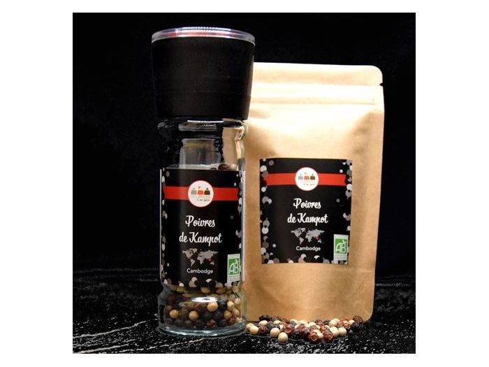 Mélange de 3 poivres : poivre noir de Kampot, poivre rouge de Kampot et poivre blanc de Kampot, 3 couleurs pour 3 stades de maturité et de séchage différents. Un poivre très élégant aux arômes puissants, frais mais pas trop piquant considéré comme un des meilleurs poivres du monde. Le poivre de Kampot nous vient du Cambodge (origine IGP). Il se marie très bien avec des viandes, du poisson gras et du chocolat Ingrédients : Poivres blancs, noirs et rouges de Kampot (piper nigrum) Certifié AB Origine : Cambodge