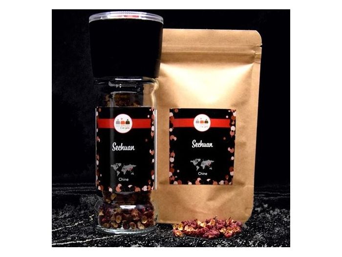 Le poivre de Sichuan est une épice douce, longue en bouche, légèrement piquante et acide avec des notes d'écorce d'orange, de griotte, de menthe. Idéal avec de la viande de canard, foie gras, sorbet d'agrumes ou fraise, menthe, abricot. Il est présenté sous sa forme sachet fraîcheur, une recharge pour ceux qui possèdent déjà le moulin Ingrédients : Baies de Sechuan Origine : Chine