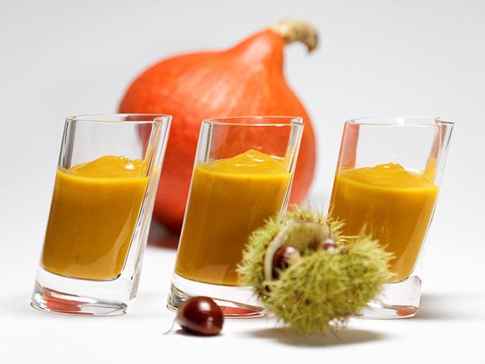 Le 1er velouté de La Combe de Job aux couleurs de l'automne et aux saveurs très festives. Vous pouvez proposer le velouté au foie gras en entrée ou dans des verrines lors d'un apéritif dinatoire. Disposez quelques éclats de châtaignes et des cubes de foie gras de canard mi-cuit sur le dessus pour une présentation soignée. En apéritif, vous pouvez accompagner le velouté au foie gras de tartinades au foie gras. Accord mets et vins : un vin blanc sec pour ne pas alourdir l'accord comme un Saint Joseph blanc.